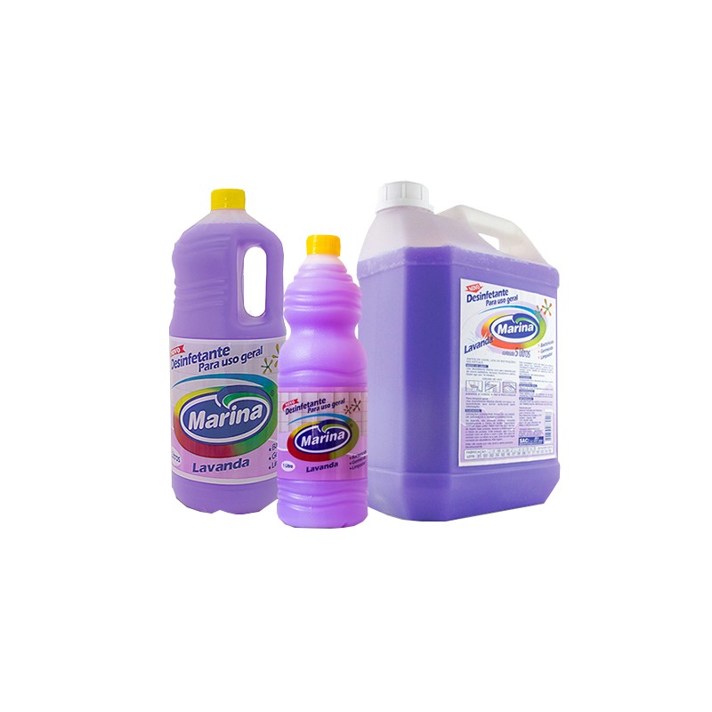 O desinfetante Marina garante limpeza e desinfecção de vasos sanitários, tanques, pias, pisos e limpeza geral, deixando um perfume de lavanda.